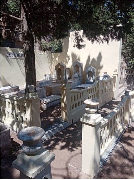 Réalisation : juillet - septembre 2022 - débroussaillage et nettoyage général, reconstruction des murs de soutien, remplacement des marbres cassés et réparation des tombes, reconstruction des murets de clôture et des murs avec corniche.