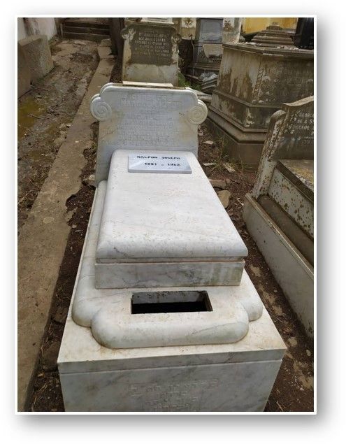 Réalisation : juillet - septembre 2022 - débroussaillage et nettoyage général, reconstruction des murs de soutien, remplacement des marbres cassés et réparation des tombes, reconstruction des murets de clôture et des murs avec corniche.
